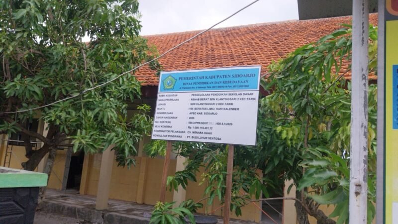 SIDOARJO – Upaya Pemerintah Kabupaten Sidoarjo dalam meningkatkan mutu fasilitas pendidikan terus diwujudkan. Salah satunya melalui program rehabilitasi berat yang kini tengah berlangsung di SD Negeri Klanting 2, Kecamatan Tarik, Kabupaten Sidoarjo. Proyek vital yang didanai sepenuhnya dari Anggaran Pendapatan dan Belanja Daerah (APBD) Sidoarjo Tahun Anggaran 2025 ini dilaporkan telah mencapai progres yang signifikan, bahkan mendekati penyelesaian.